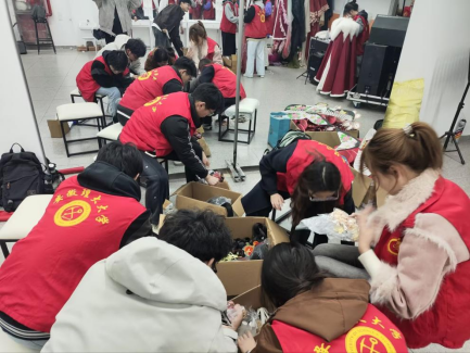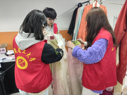 发饰首饰组的成员们则被琳琅满目的头面、簪花、步摇等饰品吸引。他们耐心地对这些饰品逐一按照材质、品类进行收纳,同时认真整理发包,以便后续二次使用。之后,大家齐心协力清洁梳妆台,将各类发剂、化妆品整齐摆放,让梳妆台焕然一新。