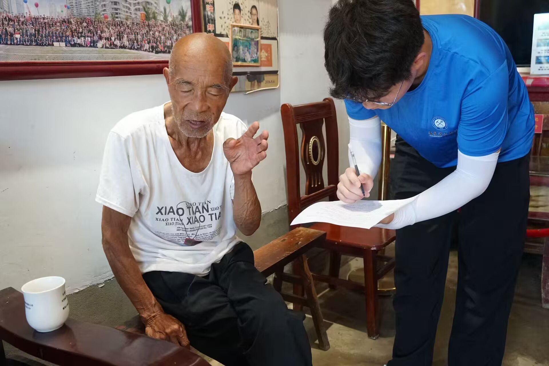 团队首站抵达郑台孜庄台开展入户调研,向村民发放问卷,深入了解“王家坝治理模式”的基层实践。在郑台孜庄台史馆,队员们走访曾参与抗洪的英雄,聆听惊心动魄的守护故事。“当时就想着保护身后的家和人,这是责任。”老英雄朴实的话语传递出深厚的家国情怀,让学子们切身感受到“王家坝精神”中顾全大局的奉献力量。