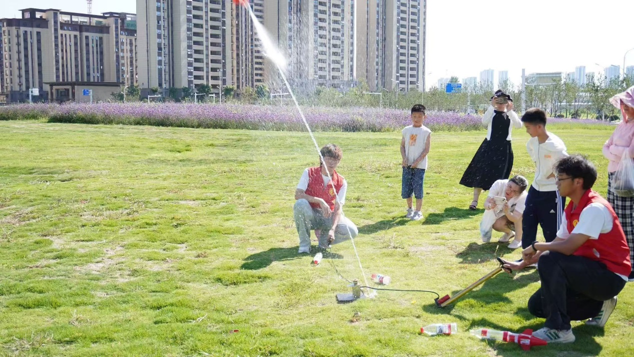 下午,孩子们带着自制水火箭来到草地,在志愿者协助下发射。随着“发射”指令,水火箭冲向蓝天,划出优美弧线。孩子们欢呼雀跃,为成功发射自豪,也种下了航天梦想的种子。