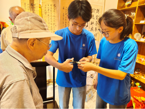 调研团成员在蒋坝非遗馆参与剪纸制作