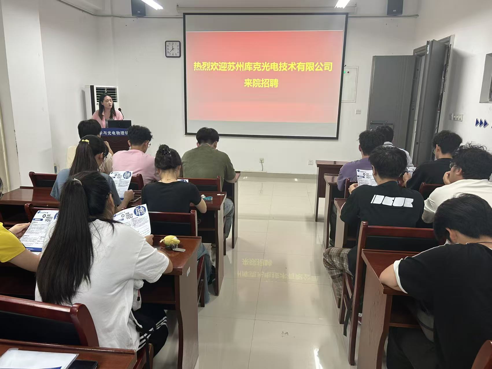 在明道楼A320成功举办了2026届毕业生首场精准专场招聘会。本次招聘会以深化产教融合、促进高质量就业为目标,特邀国内光电技术领域的优秀企业——苏州库克光电技术有限公司来学院开展专场招聘会,为光电信息科学与工程、应用物理学等专业毕业生提供精准就业对接平台,有力推进学院2026届毕业生就业工作。