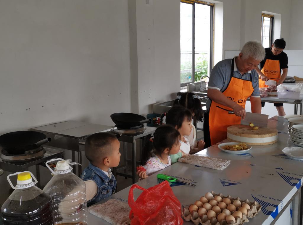 白墙灰瓦,流水潺潺,绿树成荫,在这样一番宁静雅致的乡村美景中,大家动手生火、摘菜做菜,分工明确,或是挥着锅铲炒菜,或是捡着木柴烧火,热火朝天的忙碌之后,红烧公鸡、红烧草鱼、蒜泥龙虾……等一系列色香味俱全的菜肴端上餐桌,“一家人”一起品味,度过了一段美好的乡村时光。