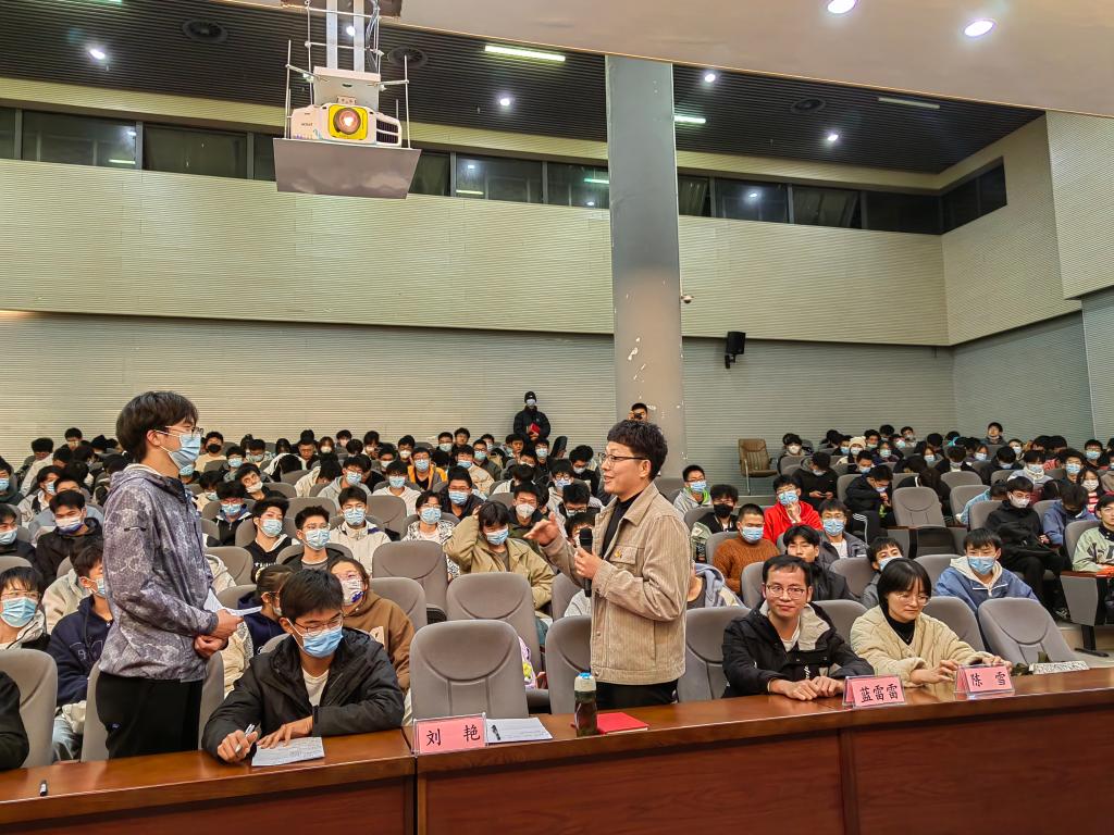 蓝雷雷博士向现场学生提出两个问题“为什么要上大学?”和“如何上好大学?”,他结合自己多年的学习经历和在企业的工作经历,告诉同学们“上大学给你选择,选择让你拥有机会”。蓝老师还分享了自己的入党故事,号召同学们积极向党组织靠拢,在安理成为更好的自己。