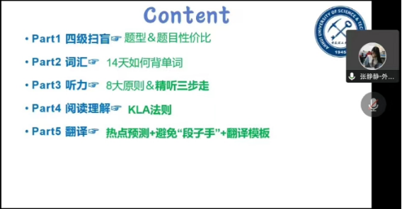 利用腾讯会议举行了大学英语四六级考前辅导讲座。本次讲座由外国语学院张静静老师主讲,主要针对听力、阅读理解和翻译等题型,漫画人