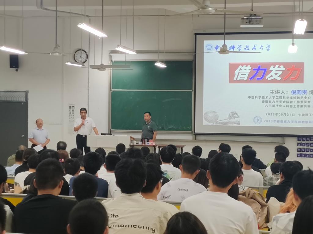 开展此次活动表示衷心的感谢。他表示学校近些年来大力推行开放式办学,积极引进校外优质资源,通过邀请知名专家教授到学校开展讲座报告会等方式,有效提升了教学的内涵和质量,帮助师生开拓了眼界、增长了知识。安徽省力学科普工作委员会专家致力于开展科普活动,宣传普及力学知识,培养年轻人的力学兴趣。学校将充分发挥自身特色和优势,积极为师生搭建科普科研的交流平台。他强调,时变之应、力学笃行,国之所需、青年所向。青年一代是国家战略人才力量的源头活水,同学们要勇于探索,投身科学研究,以拼搏奋斗之姿,肩负起时代的使命。