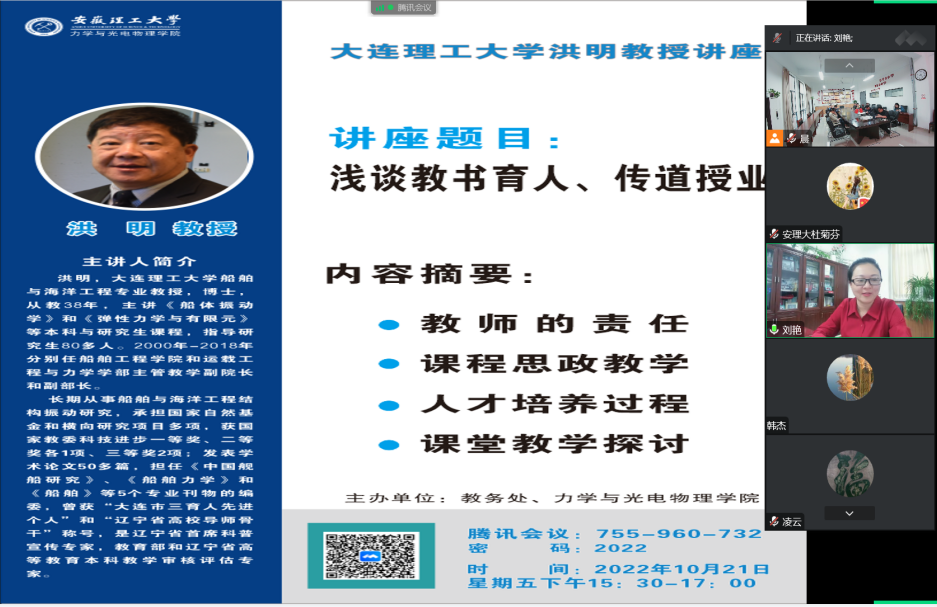 的邀请,10月21日下午,大连理工大学洪明教授为我校教师作了题为《浅谈教书育人、传道授业》的线上报告。报告会由漫画人