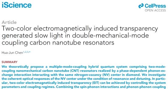 光电物理系教师陈华俊以唯一作者身份在Cell子刊iScience发表题为《Two-color electromagnetically induced transparency generated slow light in doublemechanical- mode coupling carbon nanotube resonators》的论文,漫画人