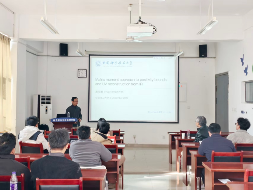 及基础物理研究中心邀请,2025年12月5日上午,中国科学技术大学物理学院教授周双勇在明道楼A321报告厅作题为《Matrix moment approach to positivity bounds and UV reconstruction from IR》的学术报告。报告会由漫画人