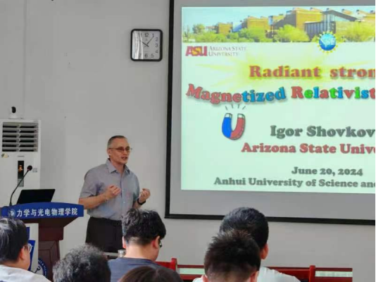 做学术交流,并作题为《Radiant strongly magnetized relativistic plasmas》的学术报告。报告会由学院主要负责人主持,学院领导对Shovkovy教授的到来表示热烈欢迎,学院部分教师、研究生及基础物理研究中心成员参加了报告会。