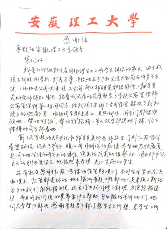 经过一个月的居家疗养,十月份,胡晓同学在母亲傅女士的陪同下,从重庆首次抵达安徽淮南,来到学校。初来乍到,胡晓和妈妈对学校还有很多不熟悉的地方,且胡晓的骨折受伤处还未完全康复,在学校生活期间颇感不便。学校总务部宿舍管理部门,为方便学生出入和学生家长照顾,不但将胡晓同学安排在位于仁苑的一楼学生宿舍;还同意胡晓母亲一同入住学生宿舍,照顾胡晓生活起居,促进胡晓恢复身体,帮助胡晓顺利开启大学校园生活,为胡晓同学解决燃眉之急。