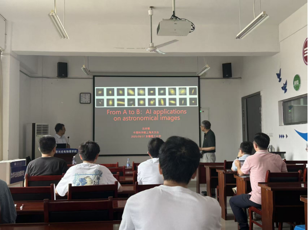 报告会上,沈世银从星系天文学基础内容引入,系统介绍了星系形态分类和星系图像的相关知识,回顾了天文图像巡天的发展历程,指出天文学已进入大规模图像数据时代;深入分析了天文图像的特征与传统计算机视觉技术(CV)图像之间的差异,强调这些特点既在推动了人工智能(AI)在天文图像中的应用需求,也带来了新的挑战;并进一步结合天文学研究的具体需求,阐述了AI技术在计算效率与图像特征提取方面的显著优势,并展示了一系列基于星系图像数据的AI应用研究成果。在交流环节,沈世银与在场师生分享了个人科研心得,并于学生互动。