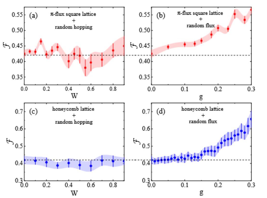 理解重整化群(RG)变换下自由度的粗粒化过程具有重要基础意义,这不仅有助于表征理论的参数空间,还对理解相变及相关集体现象至关重要。由于重整化群变换会不断去除(积分掉)从紫外到红外的微观信息,因此这种表征量应是沿重整化群流单调递减的函数,这体现了重整化群变换的不可逆性。李伟老师在报告中首先简单回顾了重整化群的研究历史和方法发展,重点介绍了重整化群的不可逆性以及其与纠缠熵(EE)密切关系。并用(2+1)维狄拉克费米子在两种保持手征对称性的随机性:(i)属于cGOE普适类的随机跳跃;(ii)属于cGUE普适类的随机通量,作用下的性质来阐明这一问题。在微扰重整化群理论框下(至两圈阶),这两种随机性均为无流动的边缘性,而由于他们属于不同对称类,因此具有截然不同的纠缠性质:尽管两种模型的纠缠熵均具有面积律主导项,但其次-leading项行为存在差异。
